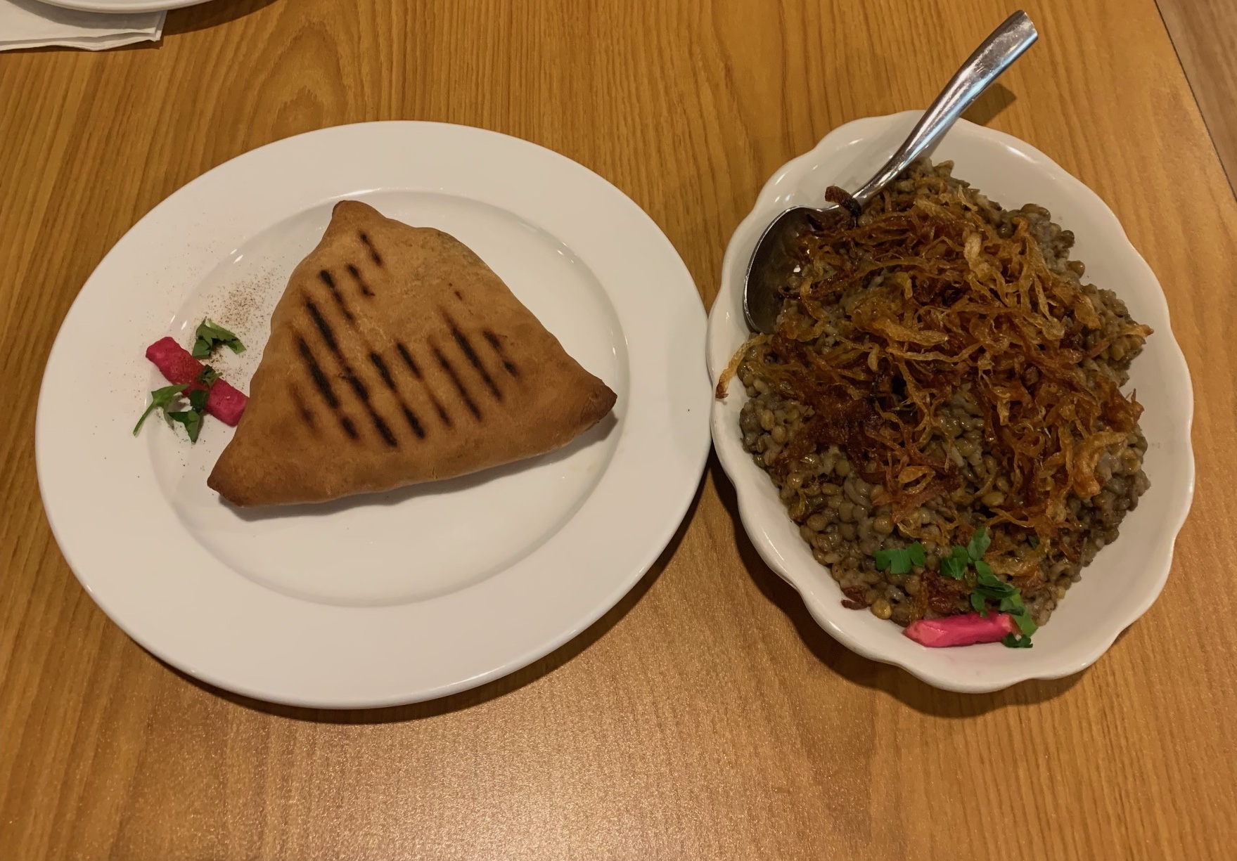 For starters we ordered a feta spinach pie ($5.99) and mujadara topped with caramelized onions ($11). Both were served hot and had great flavor. Our waiter was very friendly and shared his family background. Great place to order take out.