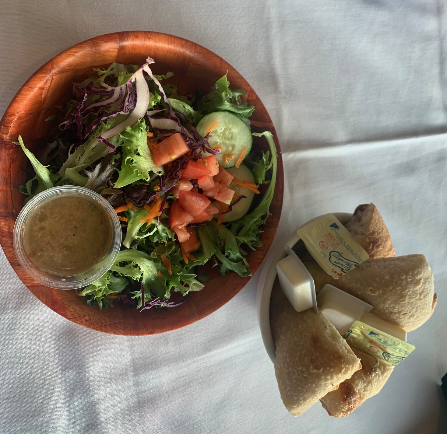 The table shared warm focaccia bread and house salads with homemade Italian dressing.