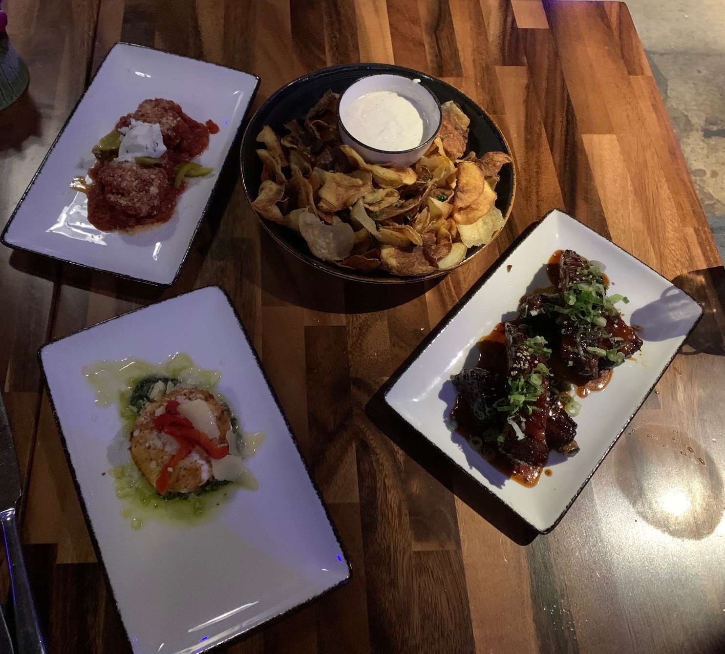 We shared tender smoked baby back ribs ($14), fried burrata ($11), chips with onion dip ($8) and meatballs ($9). Everything was tasty, the meatballs served with hot peppers and on the spicy side.